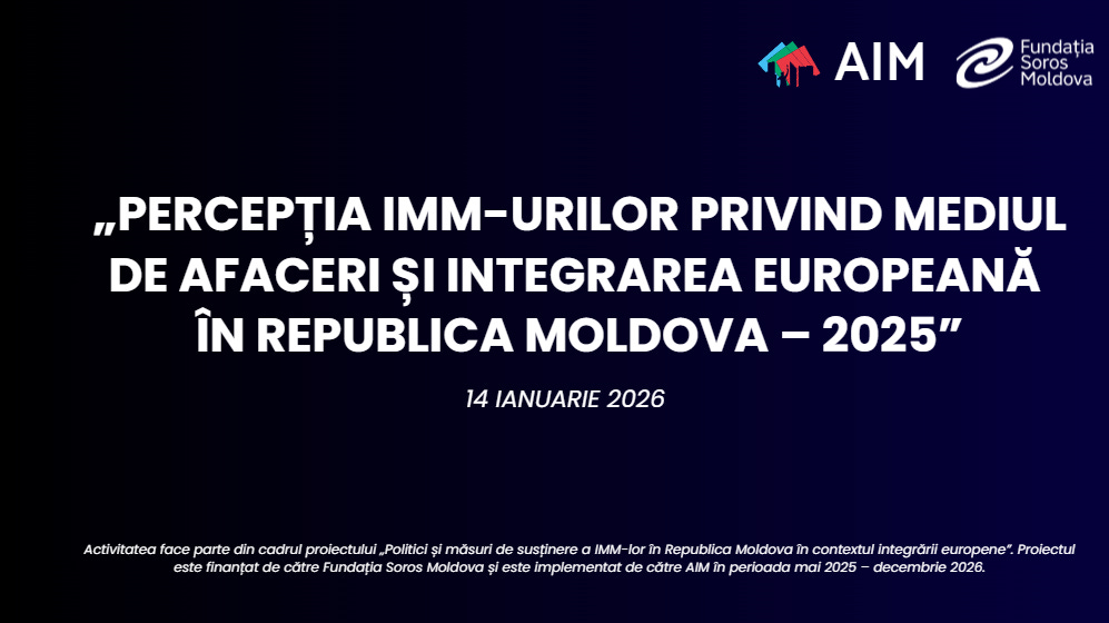 Studiul a fost realizat în cadrul proiectului „Politici și măsuri de susținere a IMM-lor în Republica Moldova în contextul integrării europene”, implementat de Alianța Întreprinderilor Mici și Mijlocii din Moldova (AIM), cu sprijinul financiar al Fundației Soros Moldova. Cercetarea a fost elaborată de echipa de experți de la iData (Date Inteligente SRL), pe un eșantion reprezentativ de 397 de companii în perioada octombrie - noiembrie 2025.